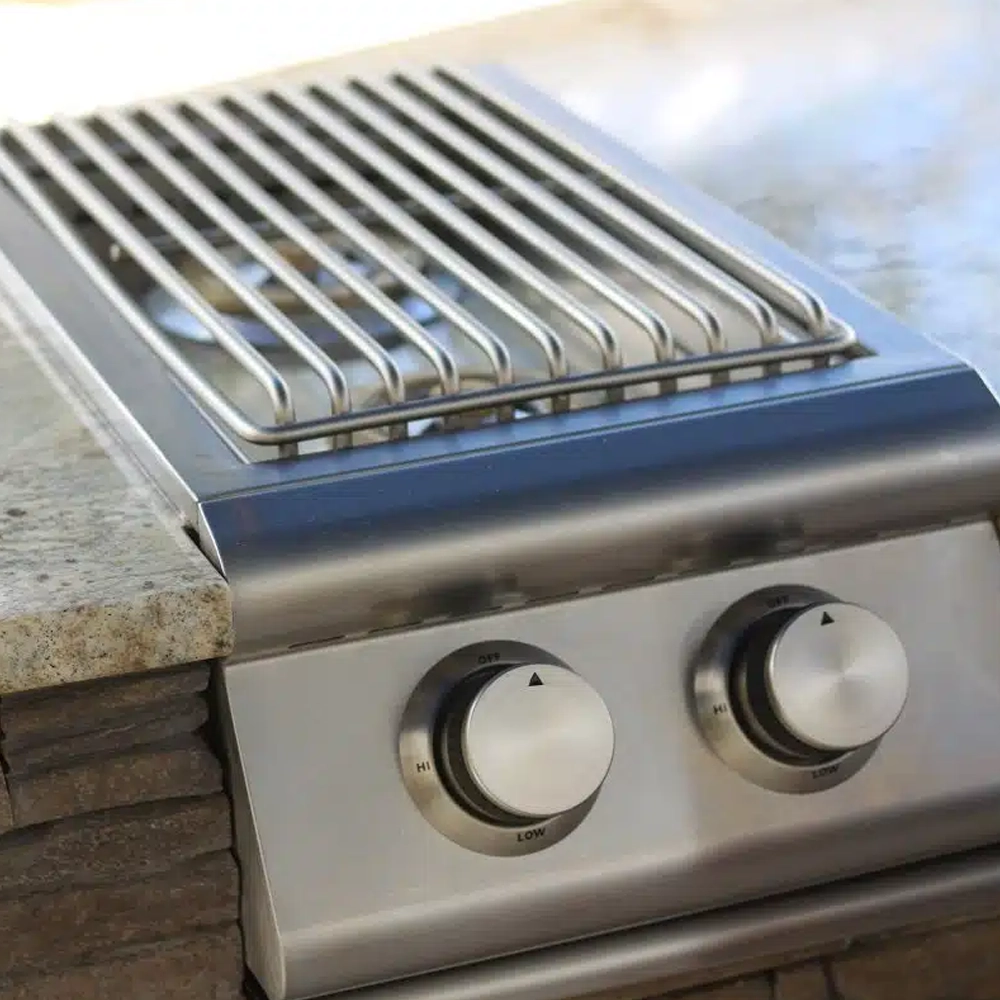 The Blaze Premium LTE NG Double Side Burner (Model BLZ-SB2LTE-NG) features two 12,000 BTU brass burners and a 304 stainless steel build. It includes LED-illuminated control knobs, push-and-turn ignition, and a stainless lid cover for protection. Designed for natural gas applications, this side burner delivers premium performance and weather resistance for Florida’s coastal environments.